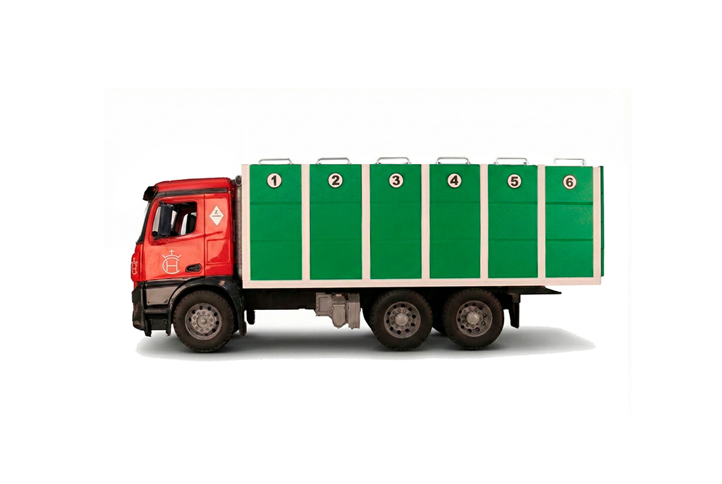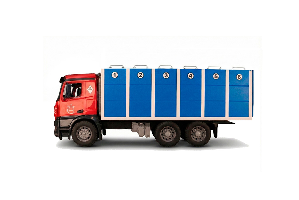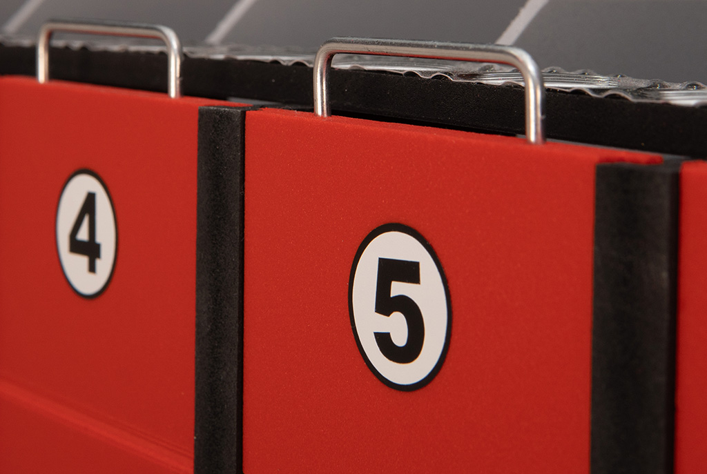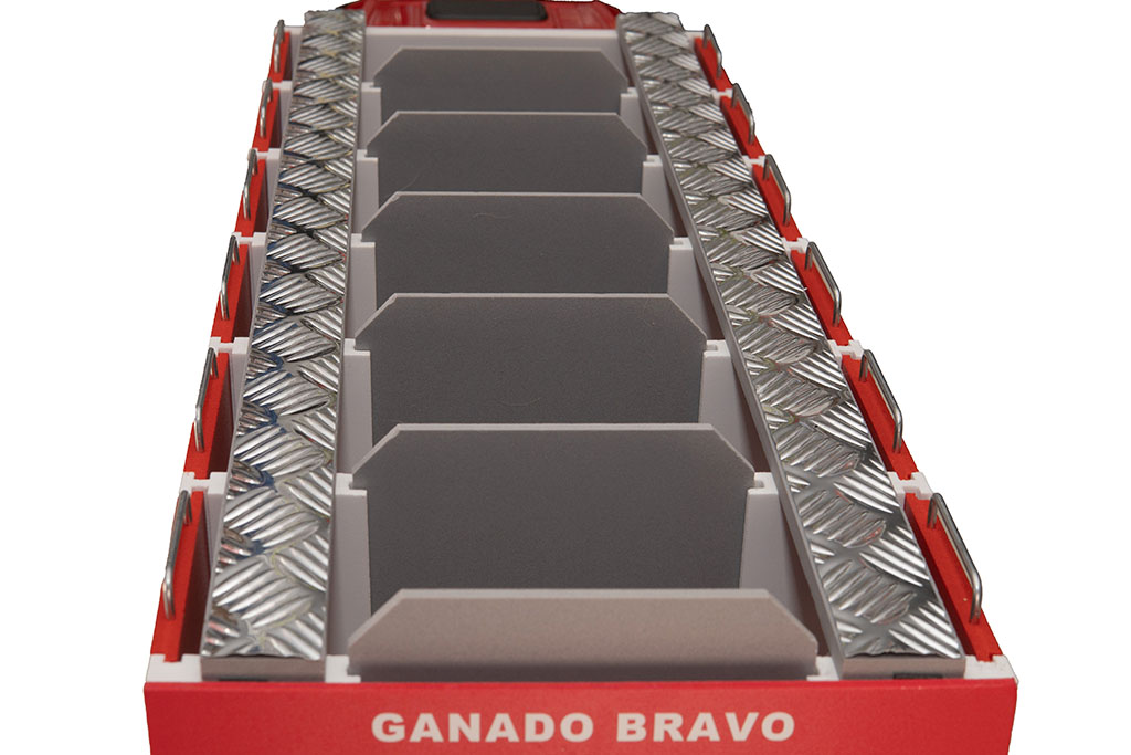 La estructura de la caja esta fabricada en pvc, consta de seis departamentos con doce tajaderas laterales y seis tajaderas separando los huecos interiores, las tajaderas son de pvc y tienen asa metálica para poder levantarlas. También tiene dos pasarelas con efecto metálico encima de la caja.